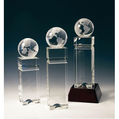 Globe tower optical crystal award/trophy. Wood base is not included. 2 3/4" W x 9" H x 2 3/4" D