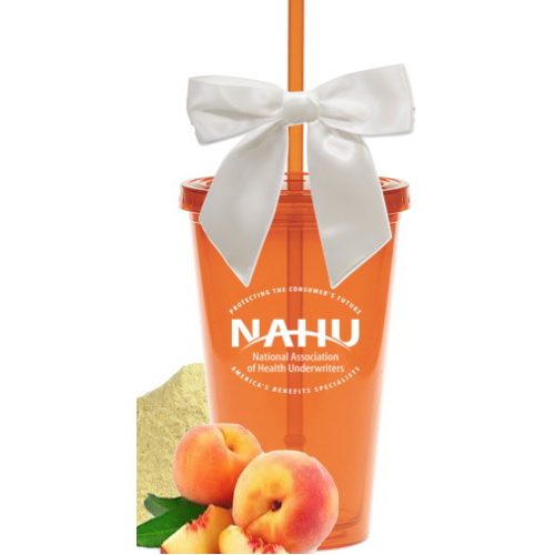 Cool off with a pitcher of refreshing and delicious Peach Iced Tea powder mix inside this double wall, 16 ounce tumbler with straw. Enough to make a pitcher full peach ice tea. We will customize an ice tea promo gift to fit your budget and event needs. Shipped bulk or to individual addresses. 3" W x 6.25" H