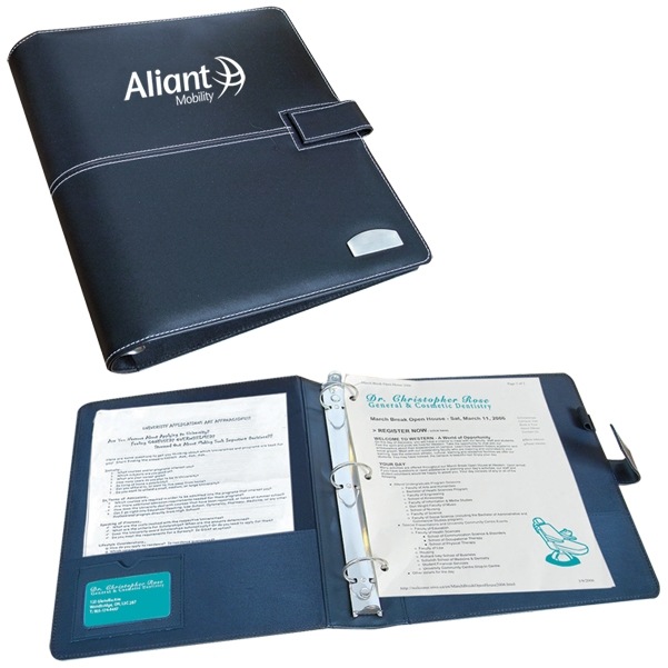 PVC Leatherette. Three O ring binder with 1.5" non-removable rings. Business card inside pocket. Dual inside slash pockets. Attractive magnetic snap closure. 10.75" W x 12" H x 2" D