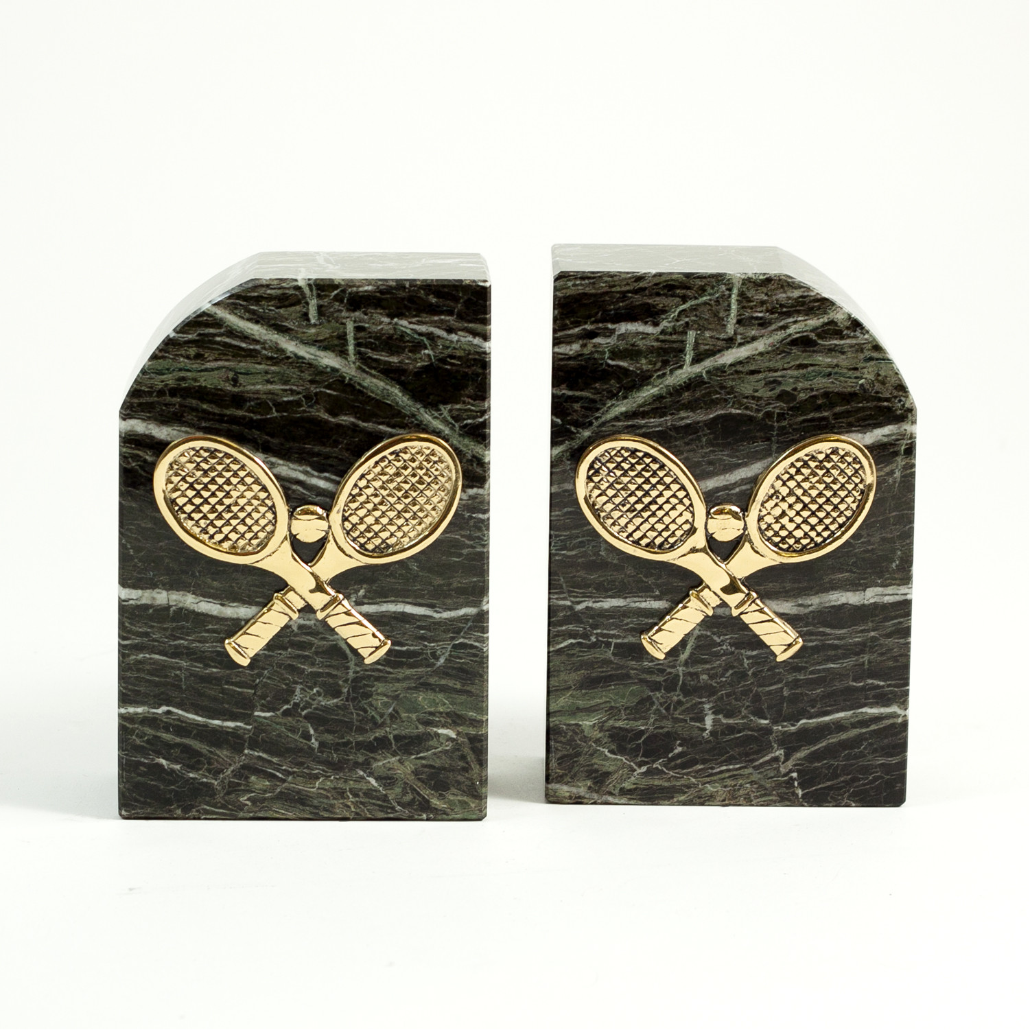 Add a touch of style and professionalism to your book collection with these bookends! Measuring 6" high, these tarnish proof tennis racquet bookends are made of marble with solid brass emblems. Customize this promotional pair with an imprint of your company name or logo and hand out these bookends at employee recognition events and award ceremonies. A great gift for business professionals, these bookends come individually packed in a gift box. 4" L x 2" D x 6" H