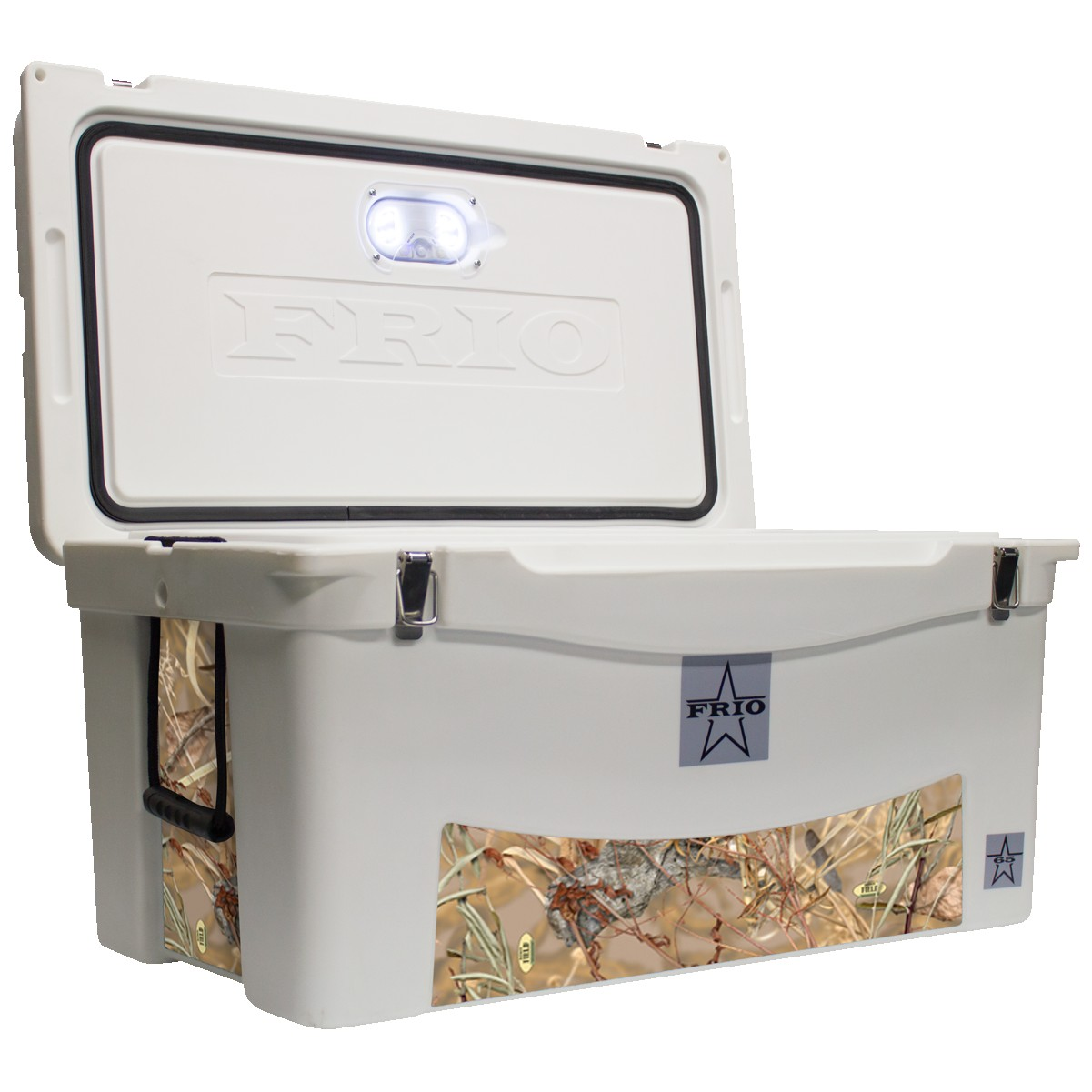 The Frio 65 Kings Camo Field is a sportsmen's best friend. The lid can give you measurements on your catch and the built in light can help you find your next beverage! This large sized cooler holds up to 100 cans with a sufficient amount of ice, keeping beverages cold for days. This 65 quart cooler comes equipped with stainless steel latches, positive seal drain plug, and two pliable plastic handles that are easy to grip and will not crack. 32.625" L x 18.5" W x 17.625" H