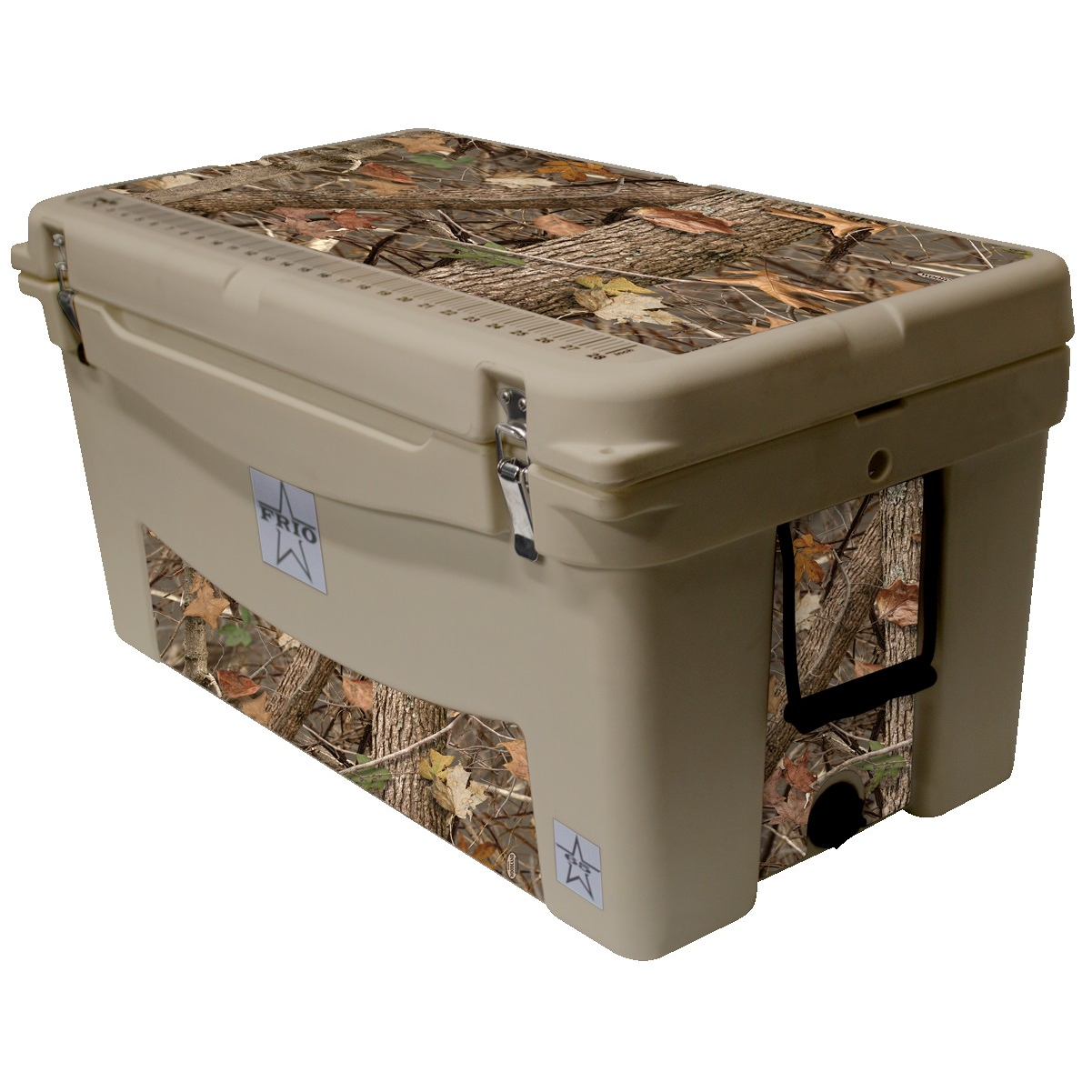 The Frio 65 Tan Kings Camo Woodland is a sportsmen's best friend. The lid can give you measurements on your catch and the built in light can help you find your next beverage! This large sized cooler holds up to 100 cans with a sufficient amount of ice, keeping beverages cold for days. This 65 quart cooler comes equipped with stainless steel latches, positive seal drain plug, and two pliable plastic handles that are easy to grip and will not crack. 32.625" L x 18.5" W x 17.625" H