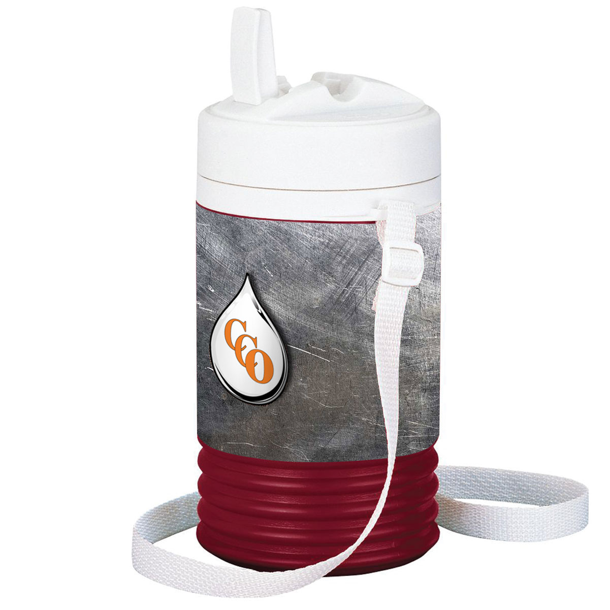 Beverage cooler with flip spout designed for sipping and pouring. Easy grip lid designed for effortless opening and closing. Wide mouth opening for easing filling and cleaning. Adjustable shoulder strap for hands free transport. Removable gasket designed for easy cleaning. Made in USA. 4.88" L x 4.38" W x 8.81" H