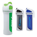 579844150424 Oz. (720 mL) BPA free aluminum water bottle with 2-in-1 lid with color sport lid covered by fashionable clear screw top. 5798441504Cylindrical bottle available in your choice of matte silver or matte black with your choice from 6 sport sipper lids. 5798441504Designed for use with cold beverages only. 5798441504Fits most auto cup holders. 5798441504Dishwasher safe; however we recommend hand washing imprinted product. Heat transfer takes 7-10 days. Complies with UL. 2 7/8" Diameter x 8 5/8" H