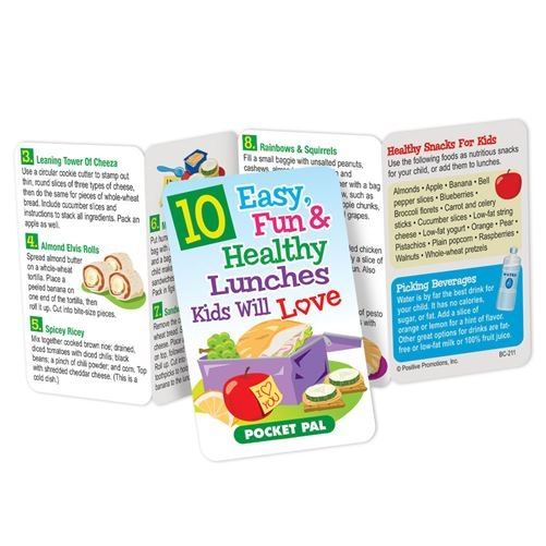 This wallet-sized teaching tool can help parents create healthy, creative lunches for their children. It outlines USDA guidelines for healthy meals and includes ten recipes for fun lunch ideas, lists over a dozen healthy snack ideas, and reminds parents to select healthy beverages. 2 1/4" L x 3 1/2" W