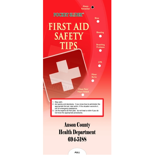 Make safety your first priority by following these important tips on supplies, choking, bites & bleeding, head injuries, burns, CPR and more. Also included is an extensive First Aid Kit supply list. Stay safe and know what to to do in an emergency. Use this educational guides as a reference to common first aid topics. Interactive Slide Chart. USA made. Fits in #10 envelope. Operates like a slide rule! Just match up the bullet point and view info and tips in cutout window. 3 3/4" W x 8 1/2" L