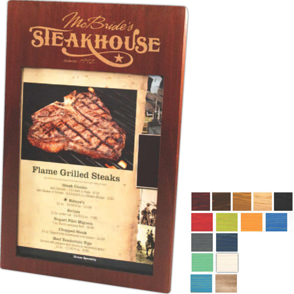 MENU SOLUTIONS TRADITIONAL & DESIGNER COLOR WOOD COVERS Manufactured with top quality, solid wood front and imitation leather back and spine. Choice of interior picture corners, top and bottom strips or three hole, screw post gusset. Choose from traditional finishes or new designer colors. Custom sizes and configurations available. 4 1/4" W x 14" L