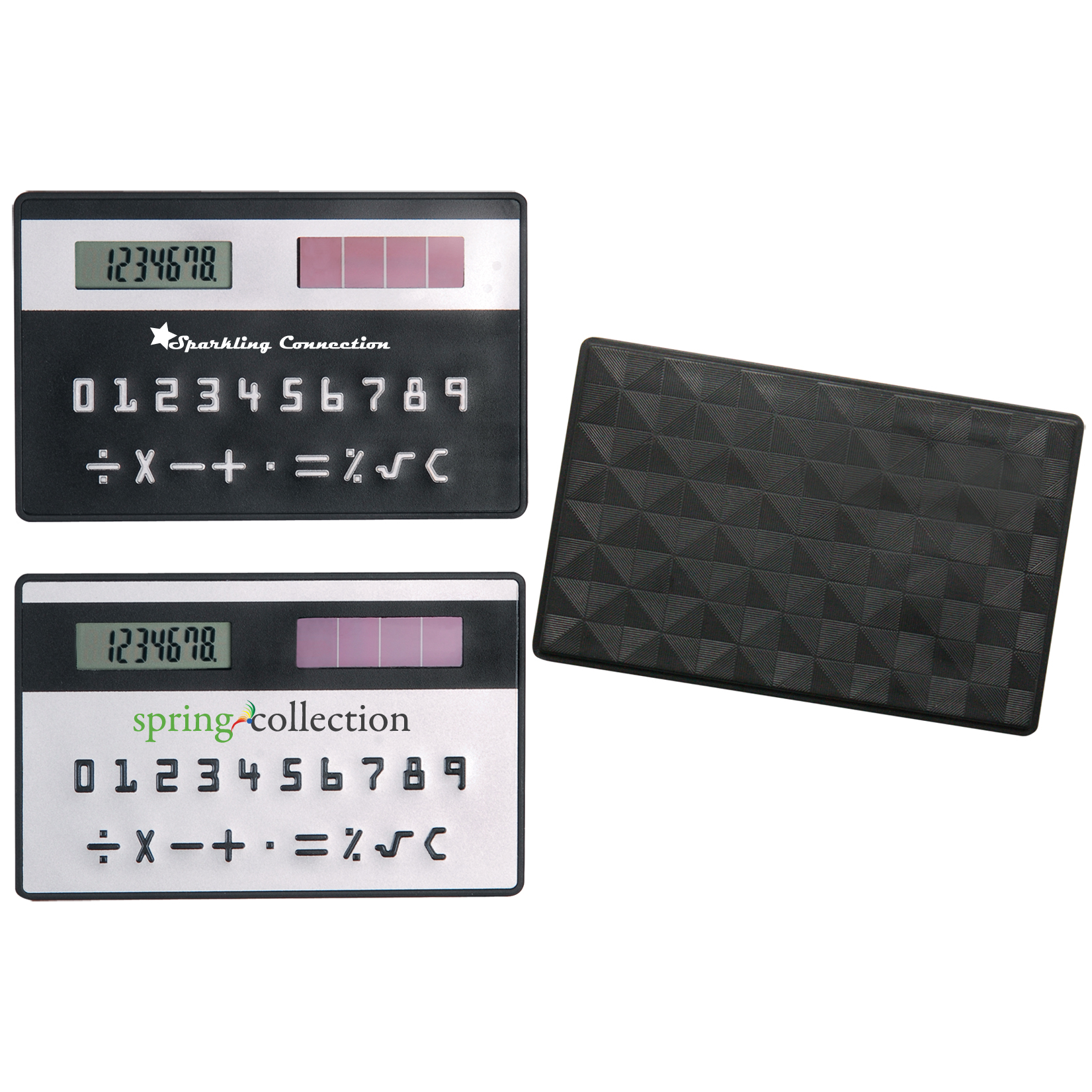 Plastic ultra-thin credit card size solar calculator with 2-tone design, raised numbers, 8-digit digital display and textured background. Great pocket sized item to give as give away gift. You can keep this handy compact calculator in your pocket or wallet. It can also be used as a small desktop calculator. 3 3/8" H x 2 1/8" W x 1/8" D