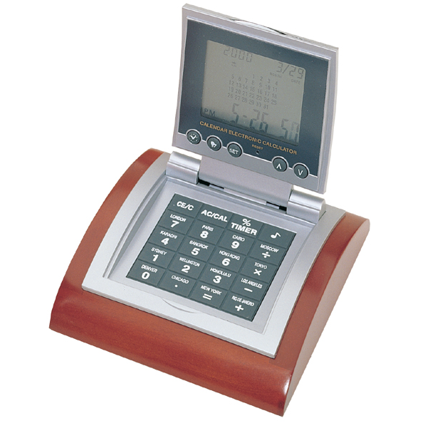 A digital calendar, clock, and calculator with a rosewood finish base. The digital display can be flipped open from the closed position to reveal a numerical keypad for use with the calculator and other functions. The unit also features the capability to set an alarm clock and display the world time. 5.5" L x 4.5" W x 2" H