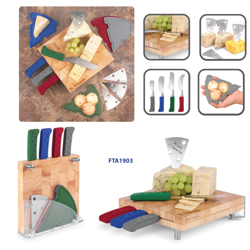 Dual purpose: cheese board for serving and a block for storage. Made of solid end grain wood. Can be used vertically or horizontally. Convenient component storage 4 Cheese Knives: Brushed stainless steel. Hand moulded grip. Dishwasher safe 4 Cheese Markers: Brushed stainless steel. Write the cheese name directly on the cheese marker with washable ink. Great for presenting multiple cheeses 4 Cheese Plates: Cheese inspired design. Fits perfectly into palm. Great for serving. 11.6" W x 7.9" H x 2" D
