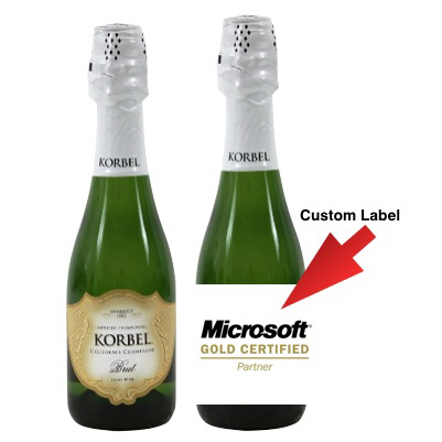 Celebrate any occasion with a bottle of bubbly! Mini Korbel champagne bottle with custom label to include your logo and/or gift message. Perfect table or party favor size. Bottles measures 7 inches tall. 187 ml. 7" H
