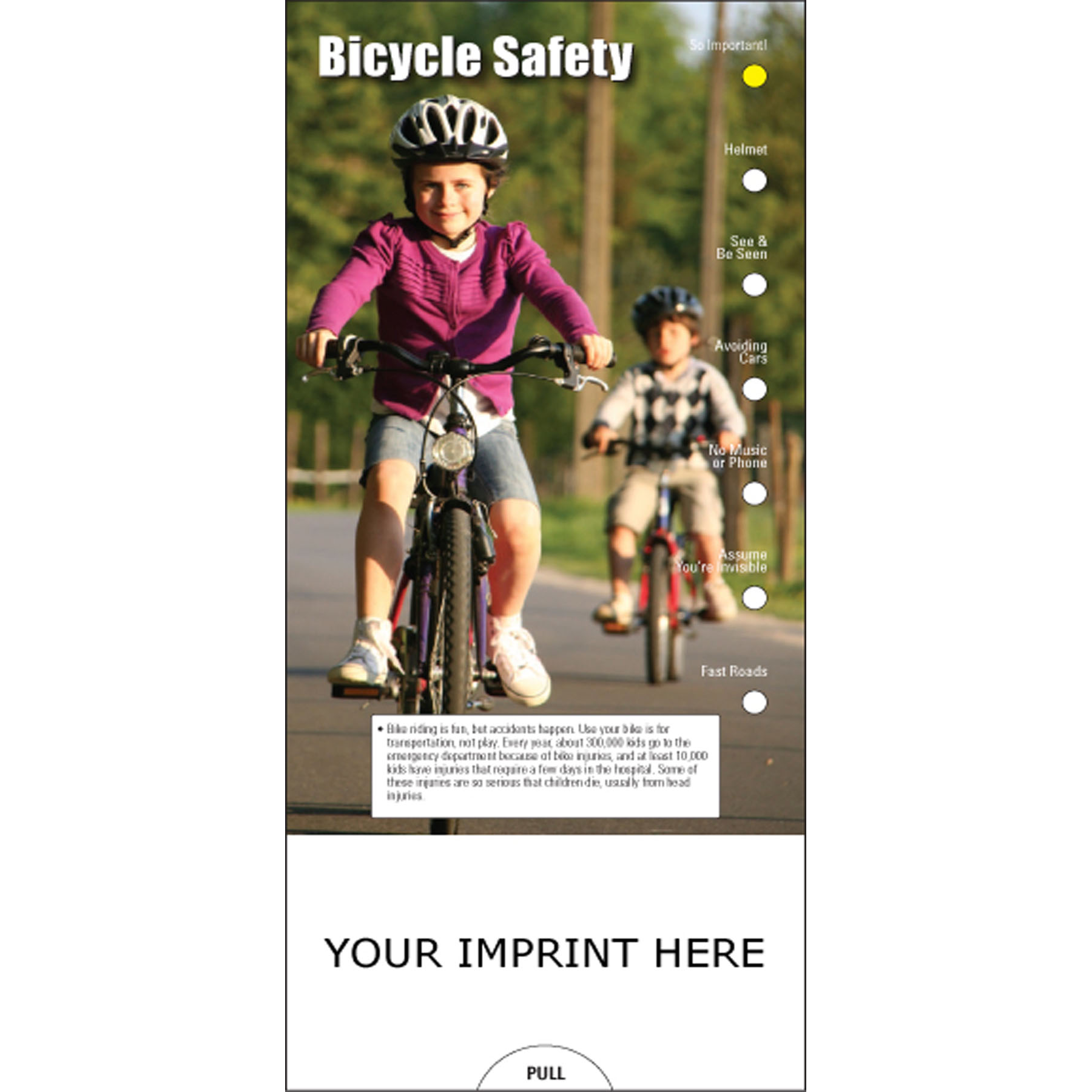 Riding a bike is great fun and exercise for the whole family, but can be dangerous. This Bicycle Safety Slide Chart will help protect you and your loved one with tips on road safety, including proper equipment and clothing. By using helmets, and avoiding cars, you can fully enjoy hours of two-wheel fun! Slide guide is sized perfectly for mailing in a #10 envelope. Excellent salesperson leave-behind product. This pocket guide is ideal for bicycle shops and sporting goods stores and fitness. 3.75" W x 8.5" H
