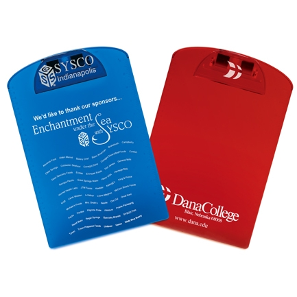 IMPRINTING: 4" w x 2" h on clip. Second imprint option: 7" w x 9" h on board. Screen printed. Price includes 1 color, 1 location