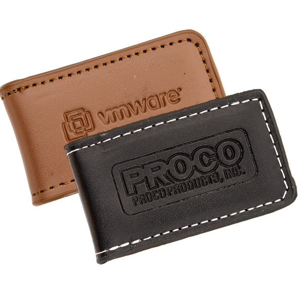 The Concord leather magnetic money clip always successfully fits the "bill" for your campaign! This Solana cowhide, top-grain leather, magnetic money clip features appealing tight stitching with matching edge coating. With bi-fold contemporary styling, this fantastic favor uses powerful magnetic clamping to secure users' money. It's perfect for any project or event. Have your logo, name or message imprinted today!. 1 1/2" W x 2 5/8" H x 3/8" D