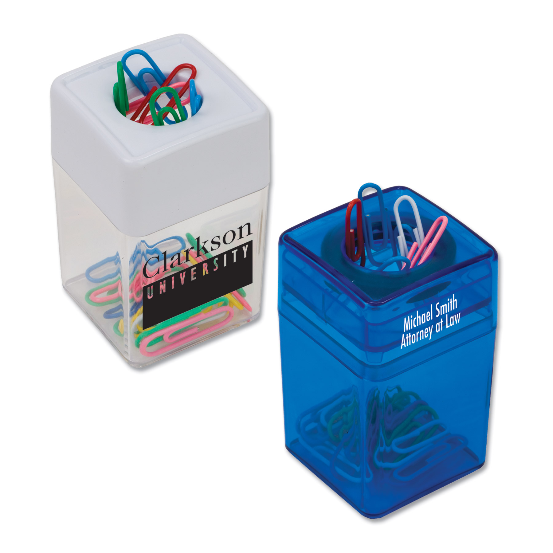 Complete with 20 assorted color paper clips. Imprint is available on base or cap. Please specify. This product is available with a Full Color Imprint at a One Color Price on the translucent blue only. 1 9/16" W x 2 3/4" H
