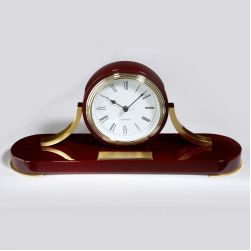 Look at the time! The St. James clock is a handsome timepiece crafted out of piano finished mahogany-colored hardwoods with solid brass accents on the tambour style case. Elegant Roman numerals and an engravable plate complete its display. A decoration for any setting, it makes an excellent gift or award. The movement is a solid brass waterfall with quartz accuracy. A battery is included. Purchase blank or customize with your company name and logo. Complies with Prop 65. 15.25" W x 6.625" H x 4.125" D