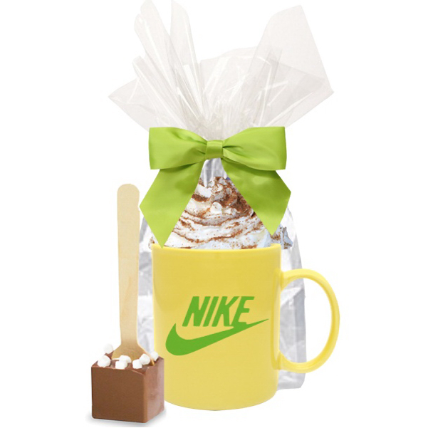 Warm up winter with this keepsake ceramic mug filled with Hot Chocolate & Marshmallow stick. Made with Belgian milk chocolate. Each mug is individually wrapped in clear cello and tied with a bow for presentation of gift giving. Other mug colors and filler options available to fit your budget. Can be customized to accommodate your office staff. We'll customize a cocoa mug to fit your budget and event needs. Complies with FDA. 3.25" W x 3.75" H