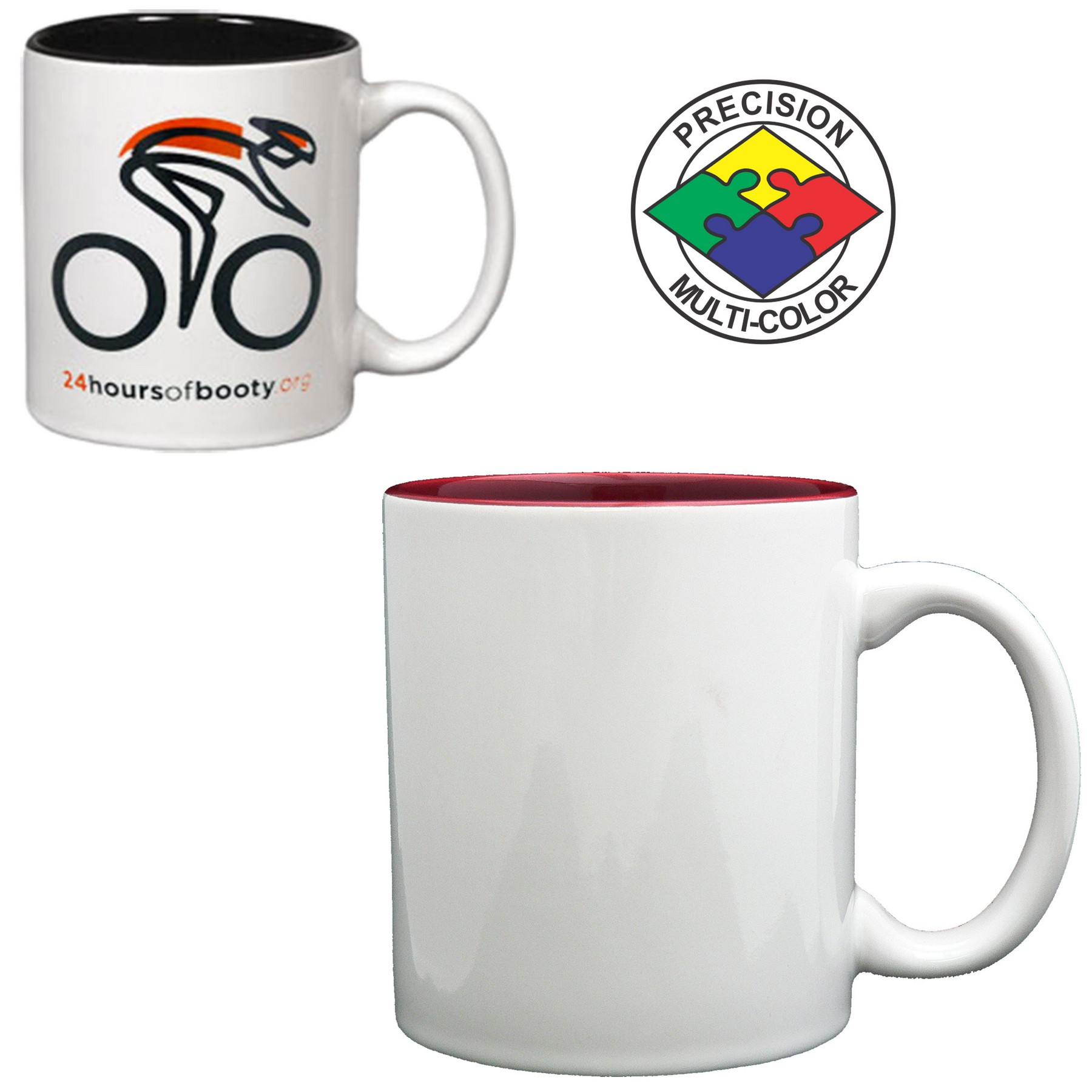 C -handle mug with a splash of color to to match your imprint! Precision direct screen 1/64" registration accuracy - 4 times better than industry standard. No hidden "decal" charges. Organic Polymer Ink-brilliant colors - PMS Color Matching. Organic Polymer Inks - good top-rack residential dishwasher resistance - microwave safe. Organic Polymer Inks are lead-free, cadmium free - don't require Prop 65 warning stickers. Other dishwasher resistant options available upon request. Complies with FDA, Prop 65. 3 3/4" H x 3.125" Diameter x 4 1/2" W