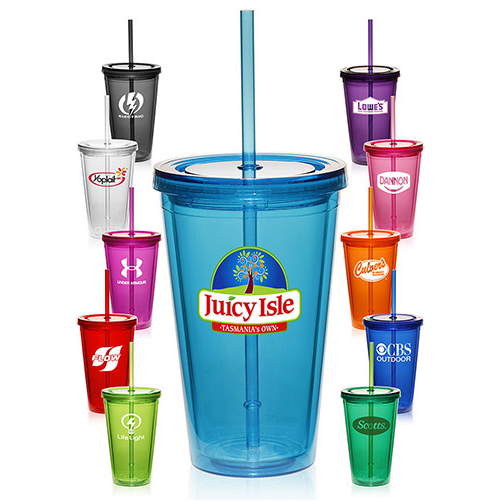 16 oz. Double Wall Acrylic Tumbler with Straw. 4" Diameter x 6.25" H x 2.5" W