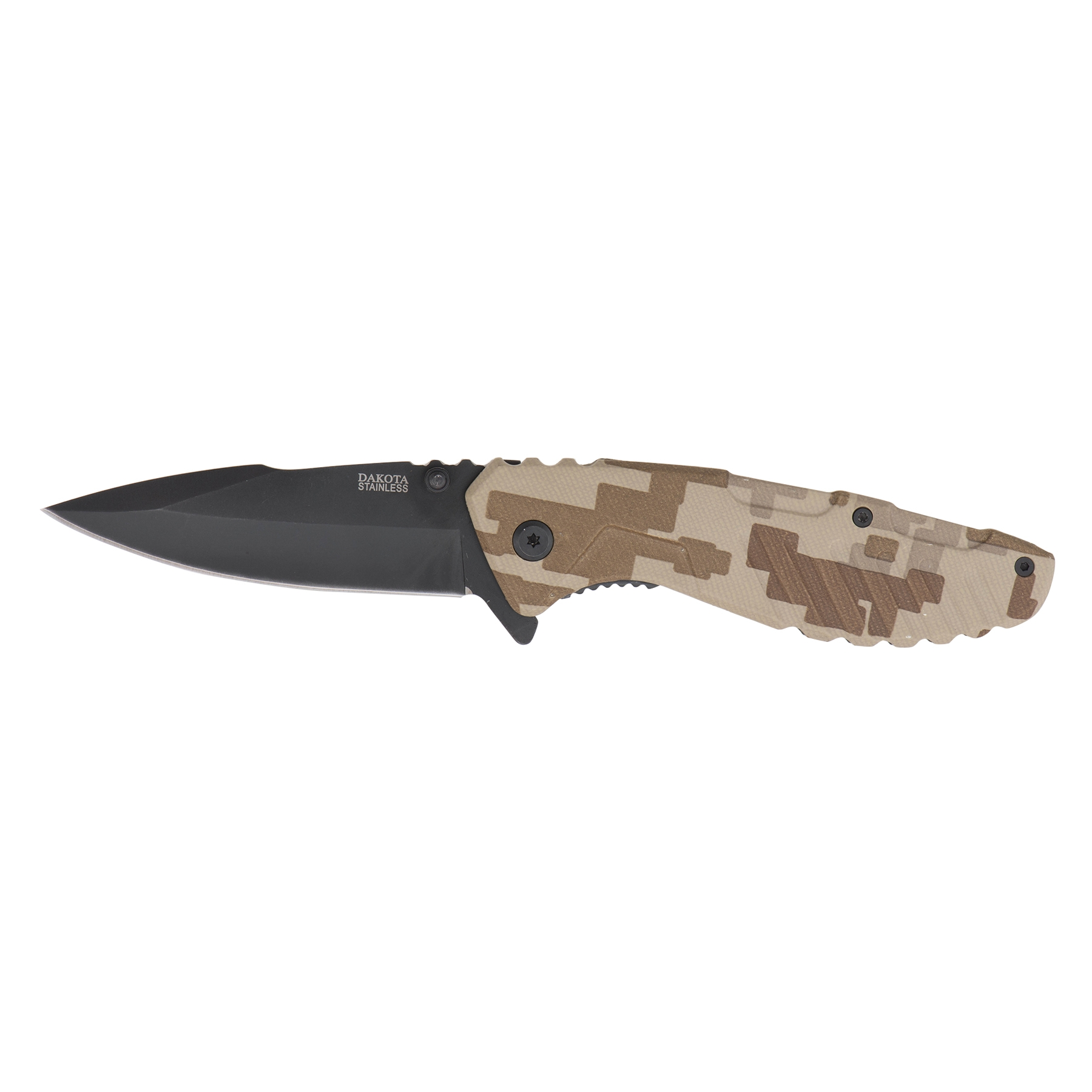 4 1/2" digital camouflage green frame lock handle with 3 1/2" black stainless steel blade, comes with clip, assisted opener and boxed. 4 1/2" L