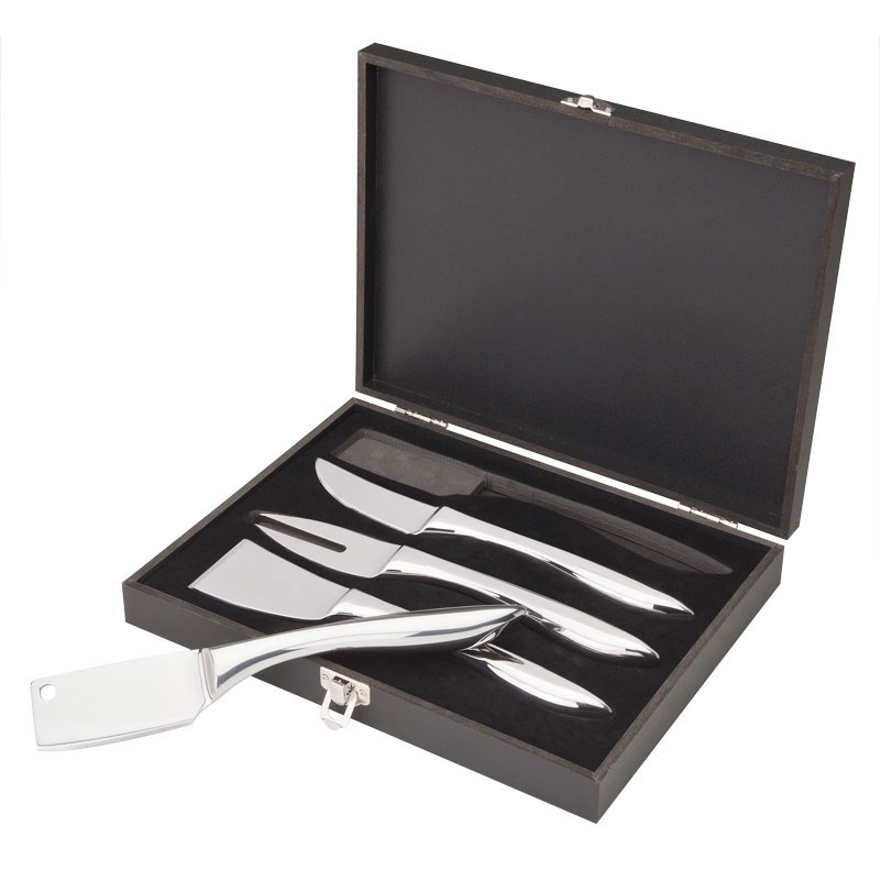 4 piece steel cheese set includes a knife, spreader, fork and slicer in a wood box perfect for storing. Complies with FDA. 9 7/8" W x 7 3/4" H x 1 1/2" D