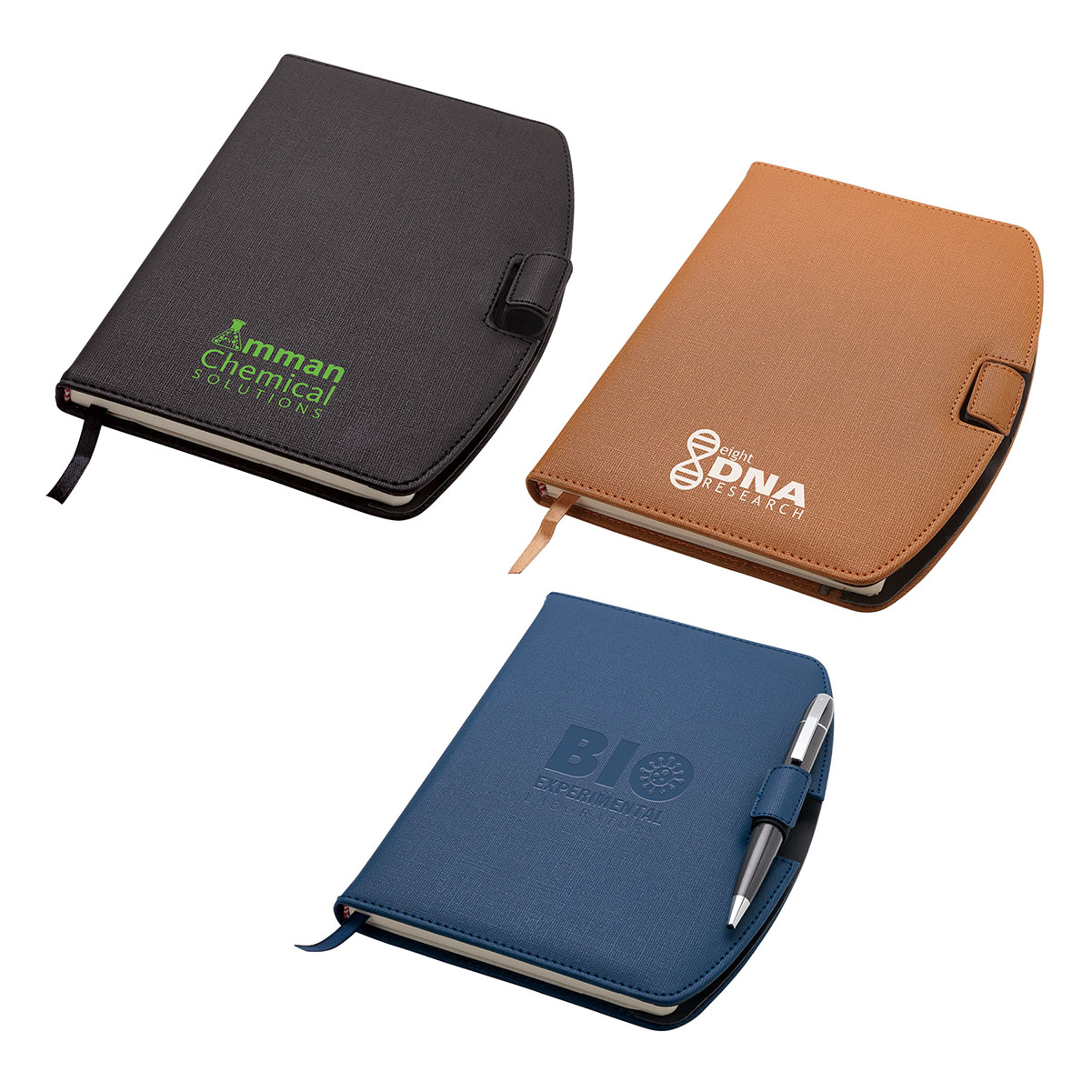 Soft textured leatherette junior size journal has a curved side opening with pen loop closure. Inside features 96 sheets of cream colored lined paper, gusseted pocket on the inside back cover and a bookmark ribbon. 6" W x 8 1/2" H x 3/4" D
