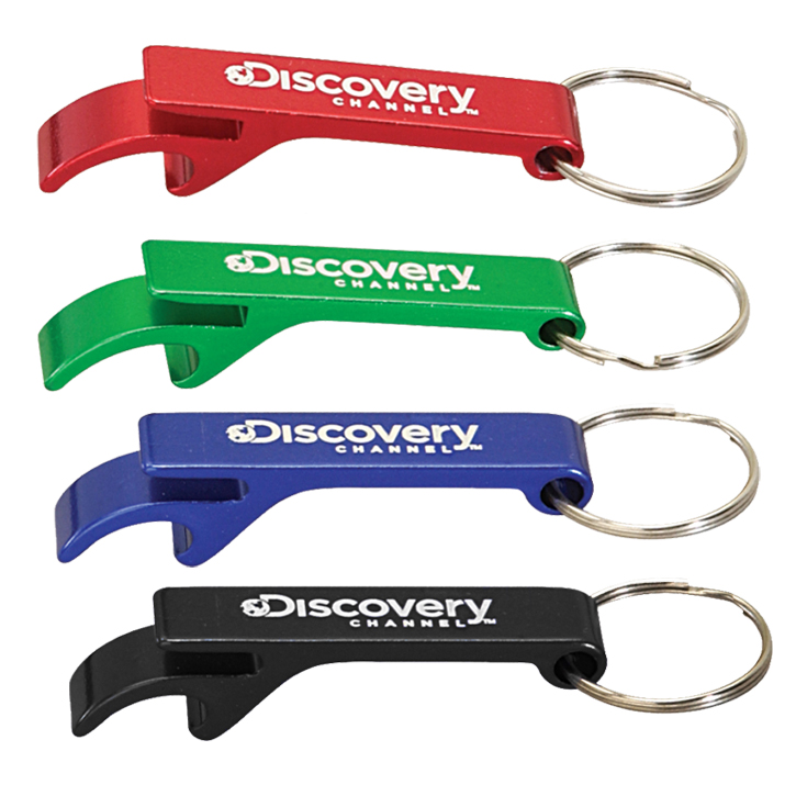 Anodized aluminum bottle opener with key ring. 2 1/4" L x 7/16" W