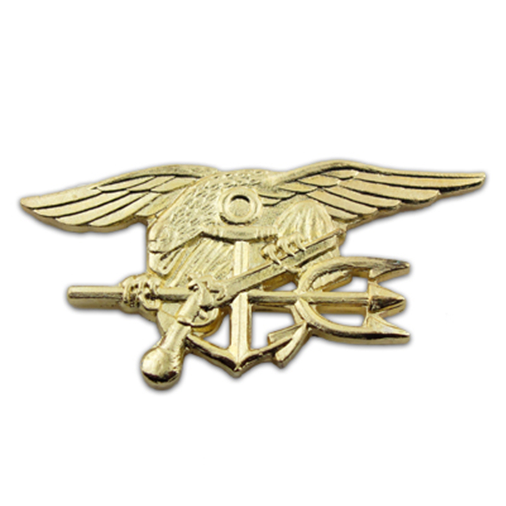 U.S. Navy Seal Team Tri Pin. Die Struck, gold plated with Anchor. Includes dual clutch backs and is individually poly bagged. 1 1/4" L