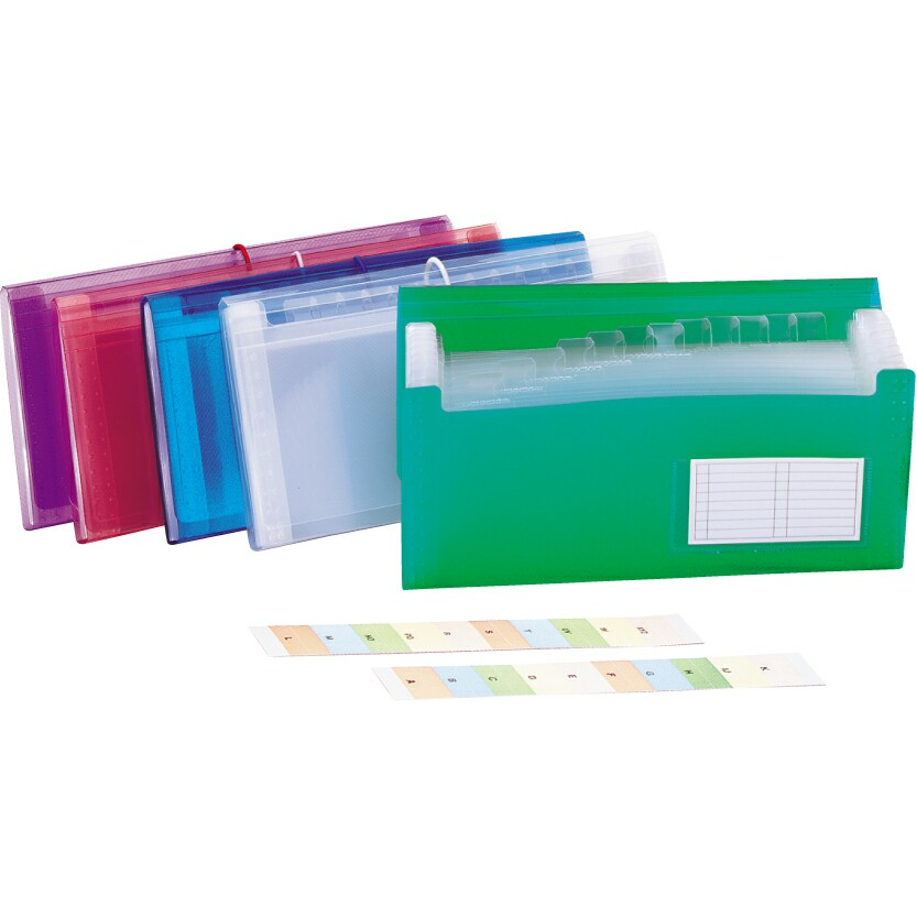 Ideal for checks with 12 clear dividers - 13 pockets and elastic closure. Includes A-Z inserts and two business card holder. 10 1/4" L x 5" W x 1" D