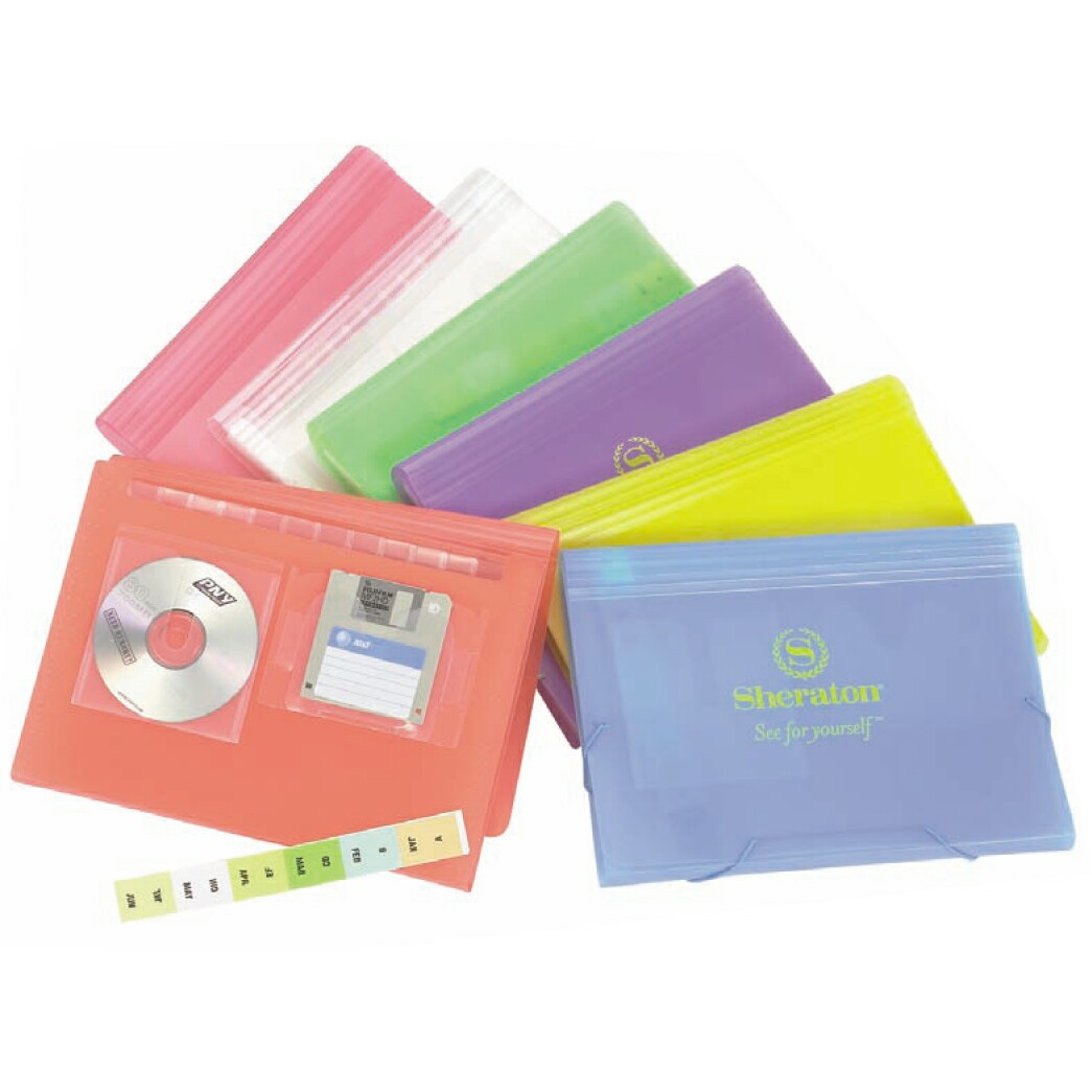 Ideal for school and office products with Clear Pockets, 12 clear dividers - 13 pockets and elastic closure. Includes A-Z inserts. 13" L x 9 1/2" W x 1 1/4" D