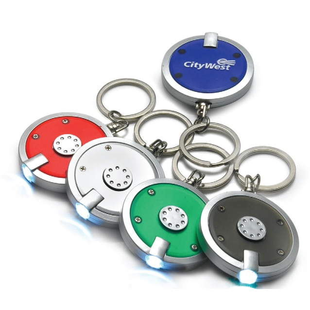 Round push button flashlight and keychain combo.