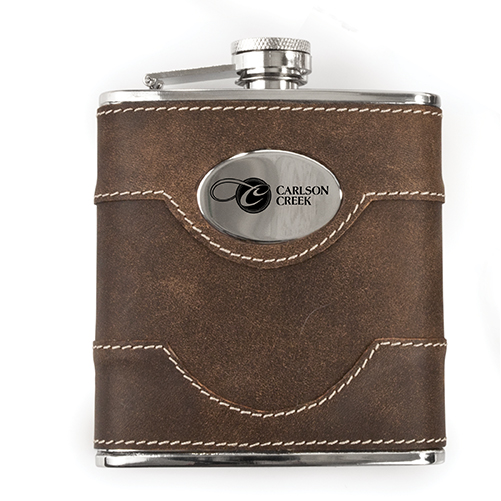 On your next outing, you'll want our handsome Country Home Bootlegger Flask in your pocket. Crafted from stainless steel and faux leather, it keeps 6 ounces of your favorite beverage at hand. 3.875" W x 7.5" H x 1.25" D