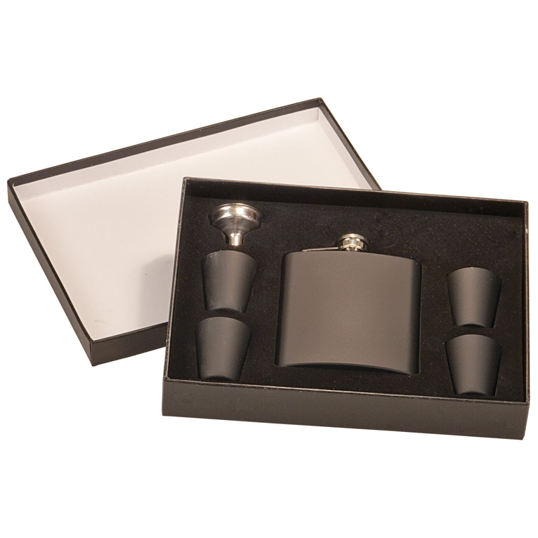 Matte black 6 oz stainless steel flask, funnel and four glasses in a black presentation box. Laser engraving on flask. Box size 6-3/4" X 8-3/4" X 1-5/8".
