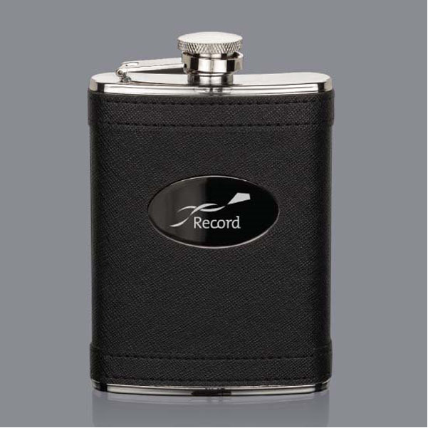 Stitched and padded woven linen is stretched across our silver metal, 6oz slim hip flask with screw top lid and flip up tab to prevent lid loss. Imprint is featured in monogram-style black nickel oval window. 6" W