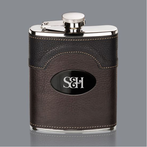 Two-tone stitched leatherette case covers our silver metal, 6oz slim hip flask with screw top lid and flip up tab to prevent lid loss. Imprint is featured in monogram-style black nickel oval window. 6" W