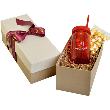 21 Oz. mason jar in a gift box with pretzels. Jars are CPSIA and FDA compliant and made from tough PET plastic. Crinkle Cut Paper available in: French Vanilla, Green, Ivory, Kraft, Light Blue, Lime, Navy, Orange, Purple, Red, Royal Blue, Silver, White and Yellow. Ribbons available in black, burgundy, emerald, ivory, navy, orange, pink, purple, red, royal, white and yellow. Boxes are brown with black, blue, brown, cream, green, or red lids. Complies with CPSIA, FDA. 12" L x 5 1/4" W x 4 3/4" H