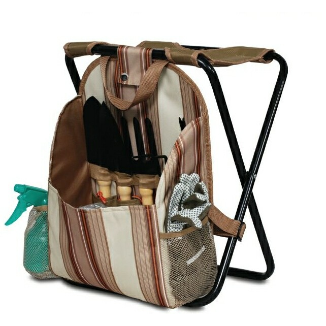 Fold away stool perfect and convenient for your long hours of gardening pleasure. Includes trowel, digger, transplanter, weeding fork, rake, sprayer and pair of gloves. It is made of 600 denier polyester. 10" W x 16" H x 7.6" D