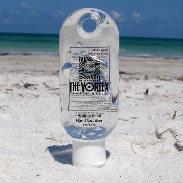 Out of house label printing - Anti-bacterial 1.9 Oz. sport tottle (upside down oval bottle, that stands on round white screw on flip top cap, with triangular top hole for attaching a clip or string) hand sanitizer gel is effective at eliminating many common harmful germs & bacteria without the use of water in as little as 15 seconds, contains 62% ethyl alcohol, is hospital grade (kills 99.9% of germs), and contains aloe and vitamins A & E. Full color laminated label always included. Complies with FDA.