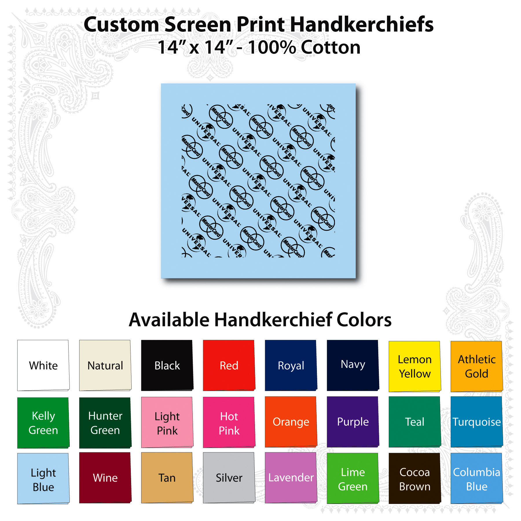 Our 14"X14" solid handkerchiefs come in 24 colors. There are plenty of options for screen printing, using your own design or blending your logo or slogan with one of our custom borders. Consider using custom screen printed handkerchiefs to identify participants in an event or for product promotion or as keepsakes. 14" L x 14" W
