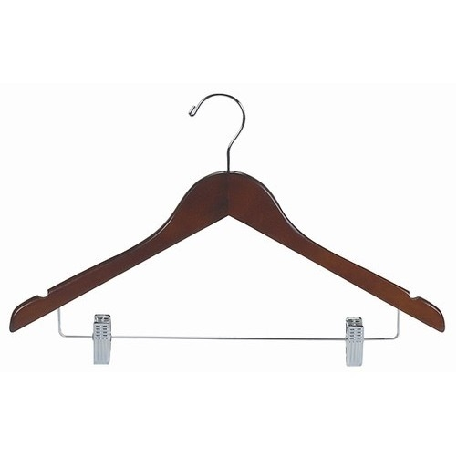 These rich walnut finished wooden suit hangers are very versatile hangers. You can hang tops, blouses or suit coats on them as well as pants or skirts from the strong adjustable polished chrome clips. The clips are fitted with soft rubber cushions to protect garments. Shoulders on these hangers are notched for the option of hanging garments with straps. 17" L x 7/16" Thick