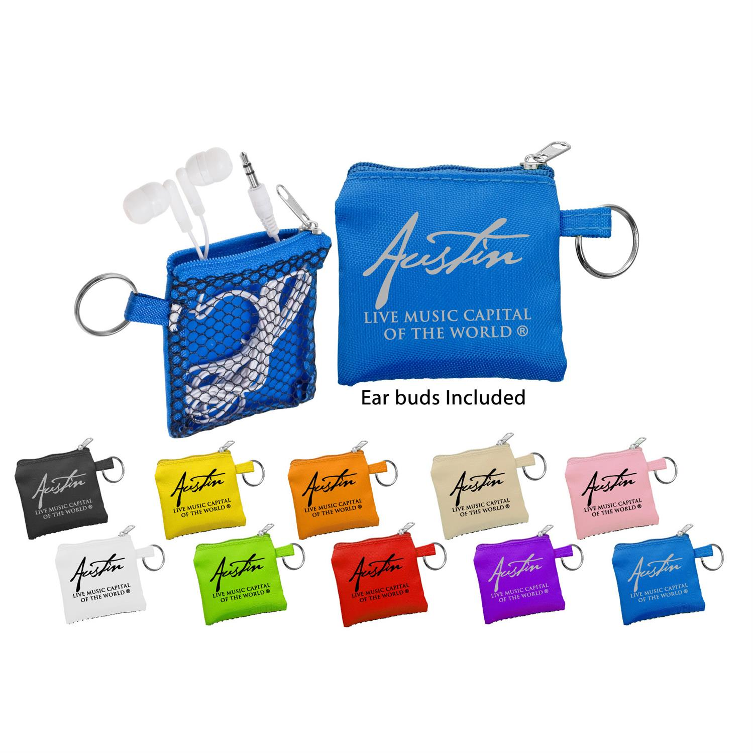 White travel ear bud in smooth fabric and black mesh travel pouch including keyring. Patented. 2.75" L x 2.75" H