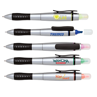2-in-1 Twist Action Highlighter and Ballpoint pen. Metallic Silver barrel with texturized rubber grip