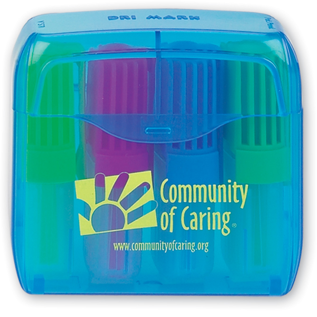4-Pack of conical tip highlighters. Cap matches highlighter ink color (yellow, pink, blue, and green). Comes in clear or translucent blue case. Made in the USA. 2 3/4" W x 2 3/8" H x 1" D