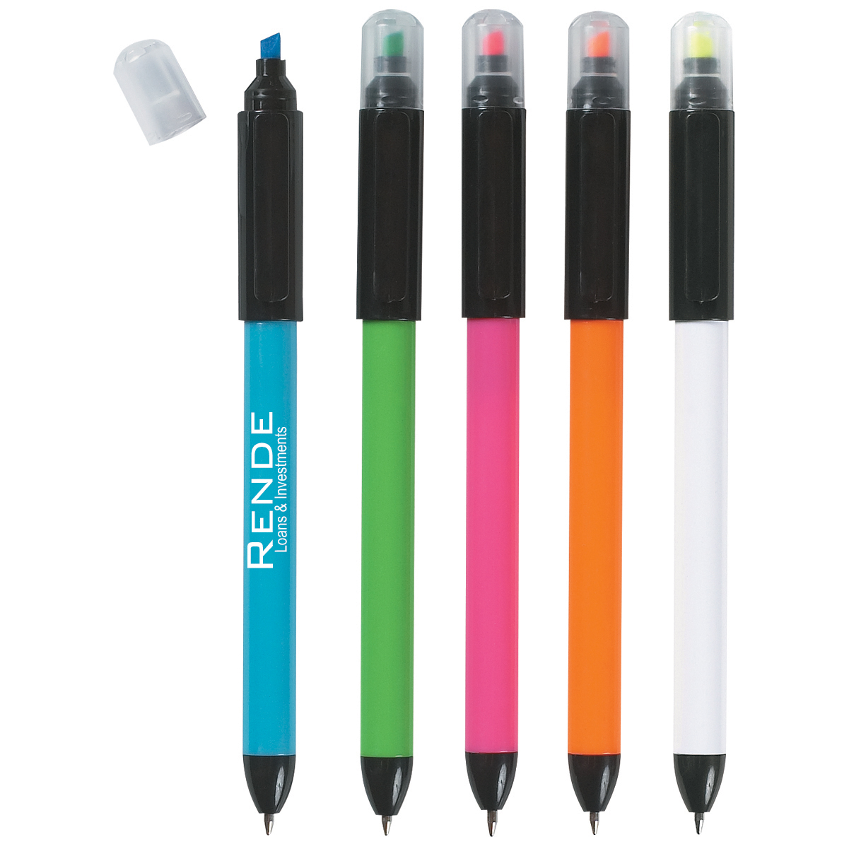 Twist action ballpoint pen with black ink and chisel tip highlighter. 5 1/2" H