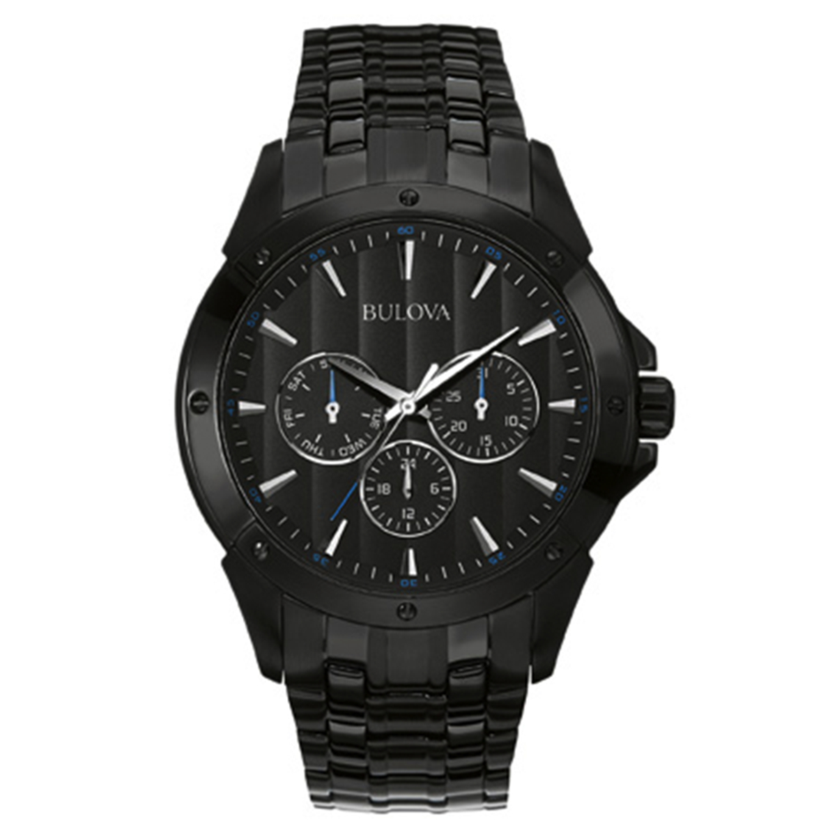 From the Sport Collection. Multifunction design in stainless steel with black ion-plated finish, patterned black dial, day, date and 24-hour subdials, screw-back case, double-press fold-over clasp with safety lock, and water resistance to 30 meters. Diameter: 43.0mm Thickness: 10.3mm