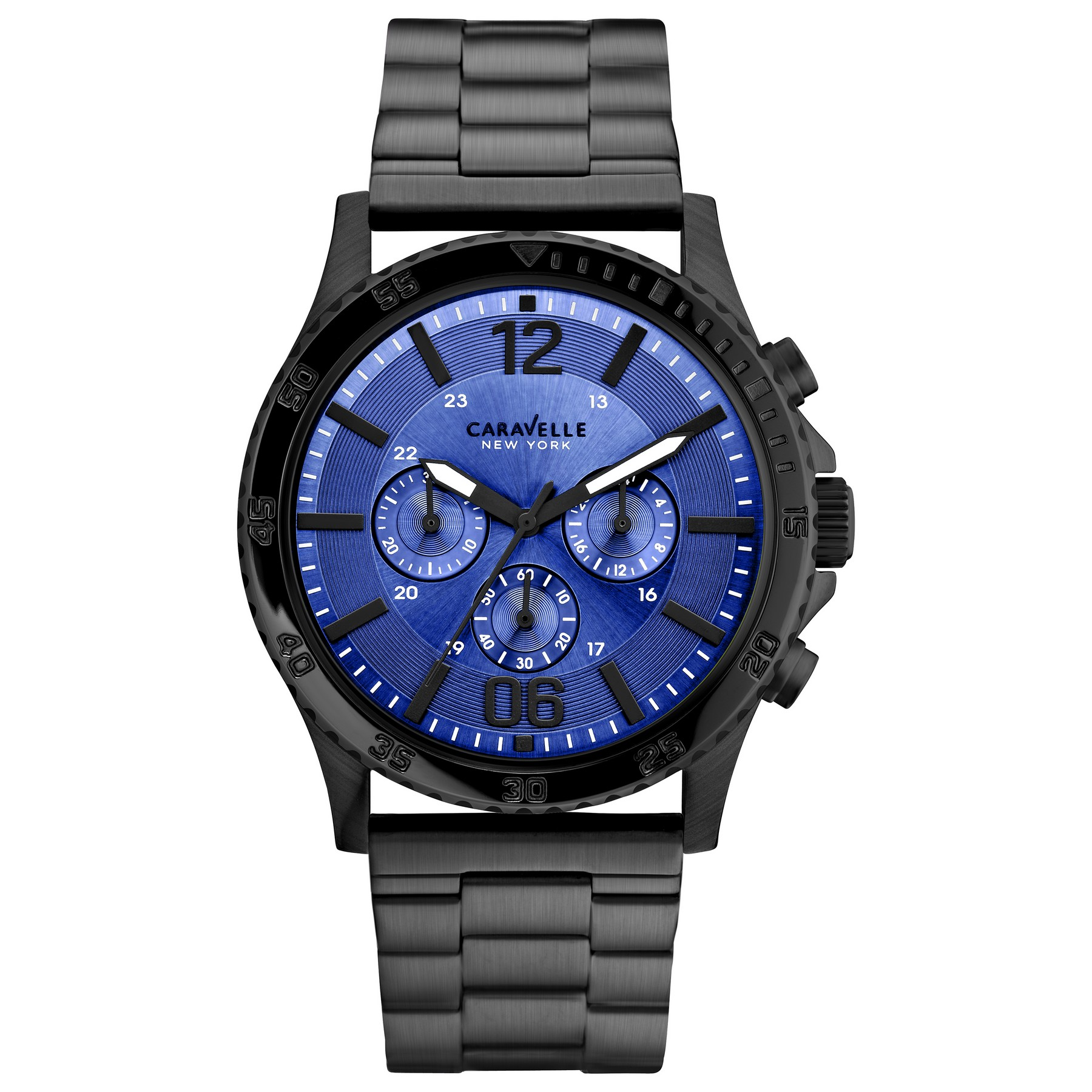 Chronograph in stainless steel with black ion-plated finish, patterned blue dial, luminous hands, 24-hour track, second hand, double-press fold-over clasp, and water resistance to 30 meters. Diameter: 44.0mm Thickness: 11.8mm