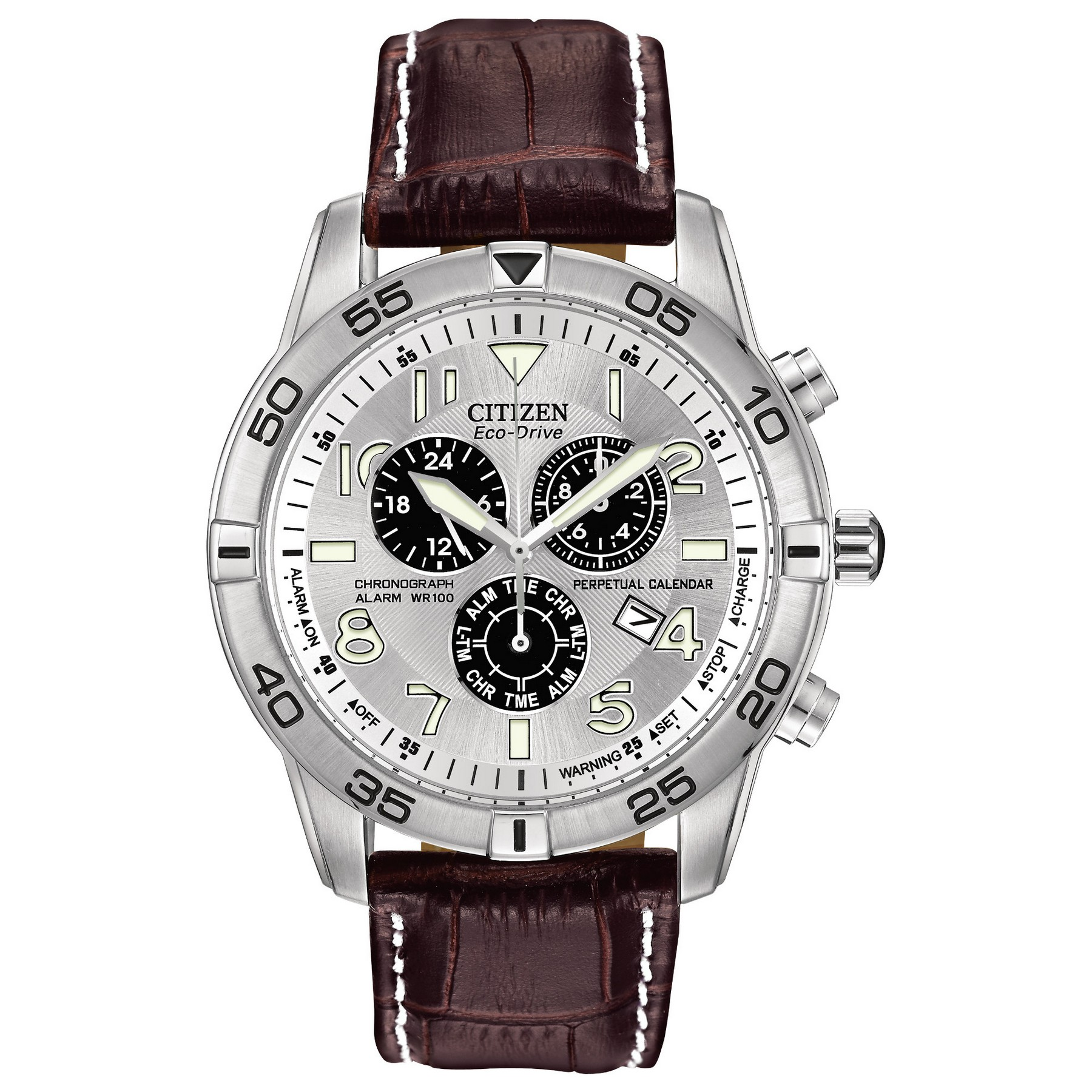 This perpetual calendar chronographis loaded with features including a 1/20 second chronograph measuring up to 60 minutes, 12/24 hour time, dual time, date, alarm, and luminous hands. The 44mm stainless steel case is complemented by a brown leather strap with white contrast stitching. Also includes a screw-back case and 100M WR, 44MM