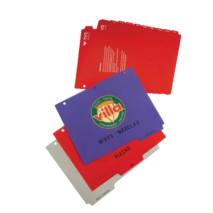 Polyethylene tabs not only repel moisture, but also are easily cleaned which makes them perfect for workshop or lab area usage. These tabs will sustain frequent handling without showing wear. No charge for tab copy typesetting. Tab extends 1/2" from sheet edge. 0.016 gauge polyethylene sheets with square corners. Tabs printed one side. 2 or 3 hole punched. Choose from the 0.016 gauge poly colors and silk-screening ink colors. 11" L x 8 1/2" W