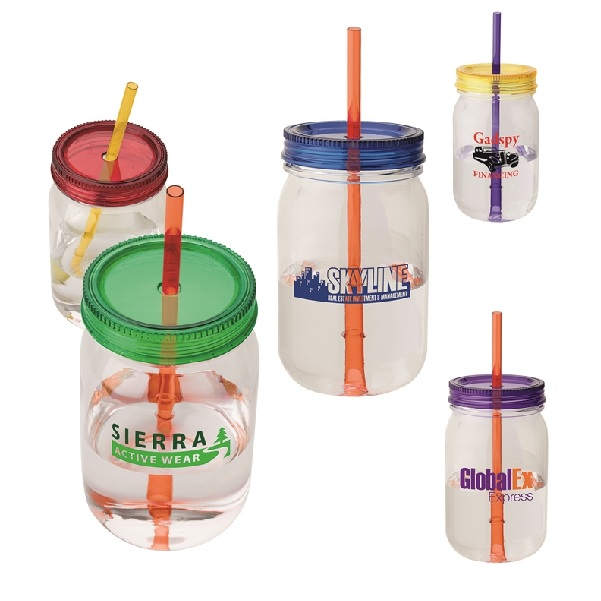 28 oz. Mason jar-shaped tumbler is made from clear, durable Tritan5798841504material and has a colored twist-off jar style lid and color drinking straw. Hand washing is recommended. Tritan5798841504is a Trademark of Eastman Chemical Company. 3 9/16" W x 5 15/16" H x 3 11/16" D