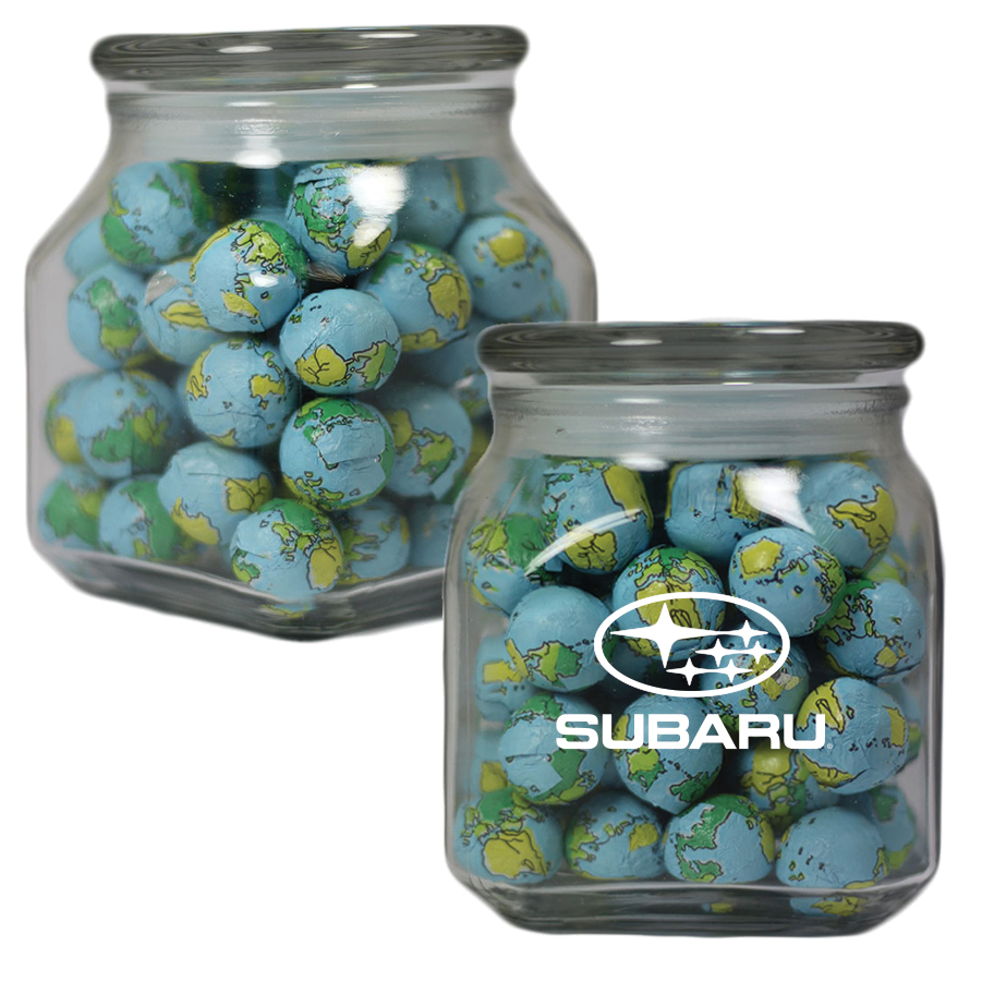 This glass Apothecary Jar comes with Chocolate Balls and is printed with a laminated 4-color process decal or a 1-color direct imprint. Great food gift idea for the holiday or Christmas. Complies with CPSIA, FDA, Food Grade, Prop 65, TSA. 4" W x 4" L x 4.5" H